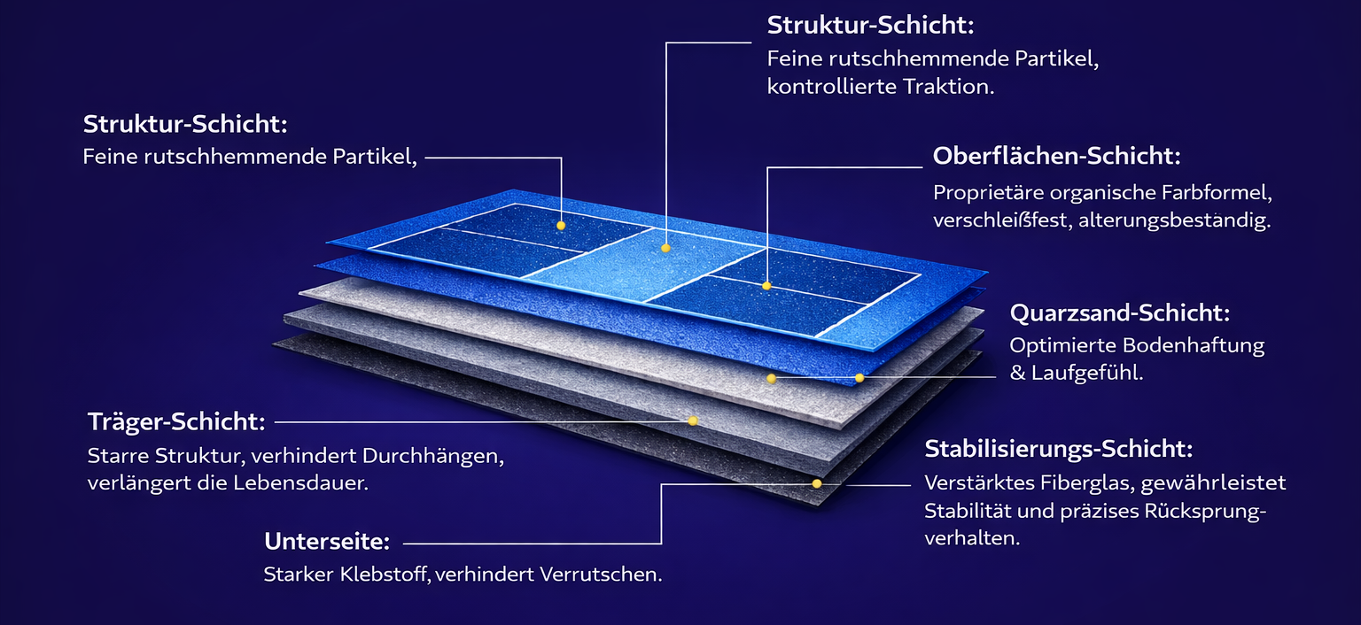 Modularer Premium-Belag aus hochfestem PVC, bestehend aus mehreren passgenauen Rollsegmenten zur einfachen Verlegung auf Indoor- und Outdoor-Pickleballplätzen. Präzises Ballverhalten, rutschhemmende, UV-beständige Oberfläche und langlebige Stabilität – ideal für Wettkämpfe, Schulen, Vereine, Hotels und Freizeitanlagen.